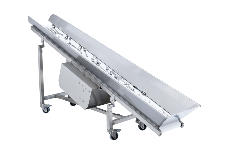 - Les couverts sont acheminés par un tapis convoyeur de 1,5 mètre de longueur